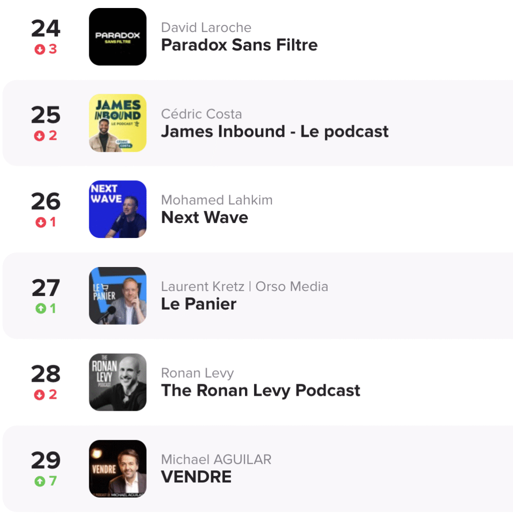 A la fin du mois (mars 2025), le podcast a aussi été dans le classement des meilleurs podcasts français d’Apple Podcasts, dans la catégorie Entrepreneuriat, dans les charts Ausha (la plate-forme de podcasts n°1 en France), juste derrière le podcast à succès Paradox Sans Filtre de David Laroche.