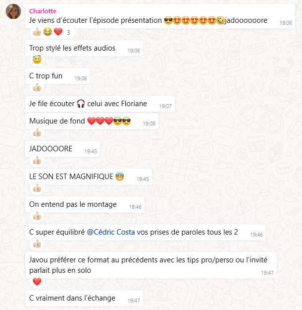 Les réactions des auditeurs du podcast ont été immédiates : « Le son est incroyable Cédric !! », « J’ADOOOORE », « On entend pas le montage », etc.