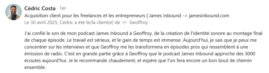 Ambitieux et exigeant, il souhaitait redémarrer début mars 2025 son activité de podcasting avec une tout nouvelle identité sonore et avait besoin de quelqu’un pour réaliser un montage de qualité pour les nouveaux épisodes, afin de garantir au mieux son succès auprès de son audience.