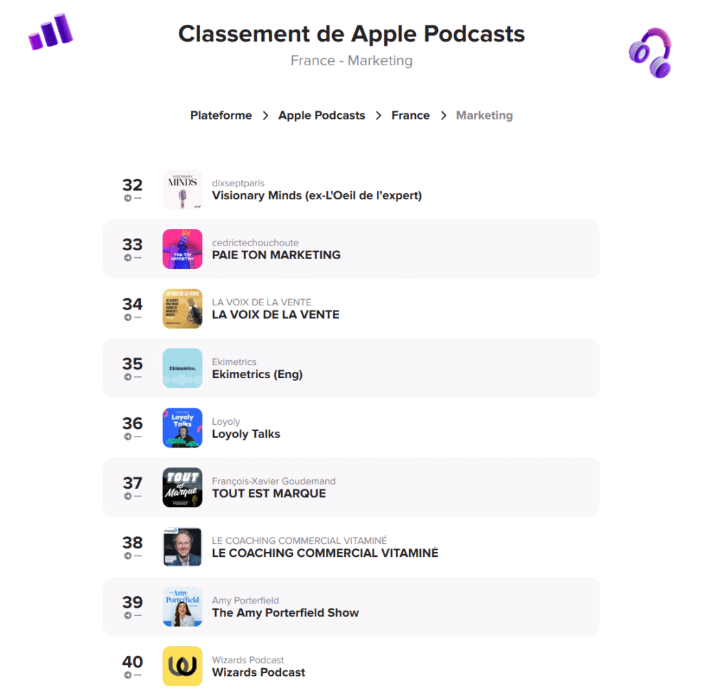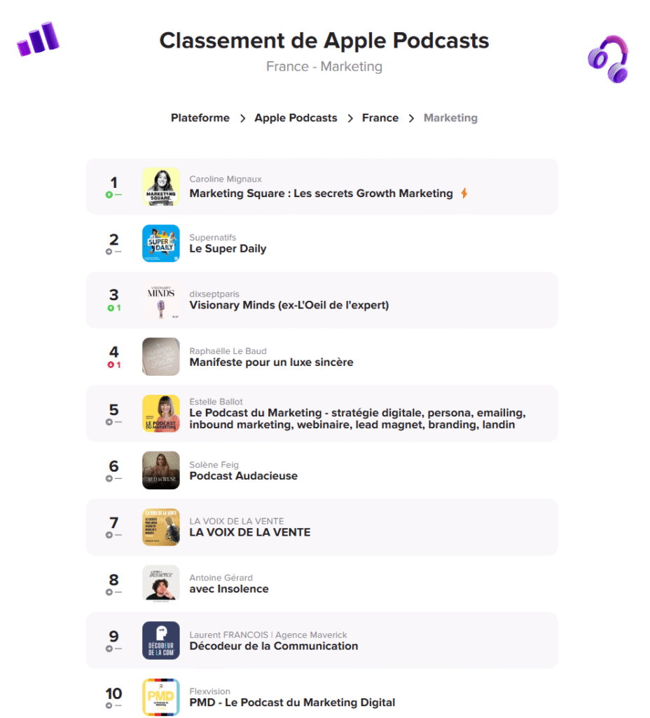 En outre, le podcast a atteint la 34ème place fin avril puis la 7ème place début mai dans le classement des meilleurs podcasts français d’Apple Podcasts, dans la catégorie Marketing, dans les charts Ausha.