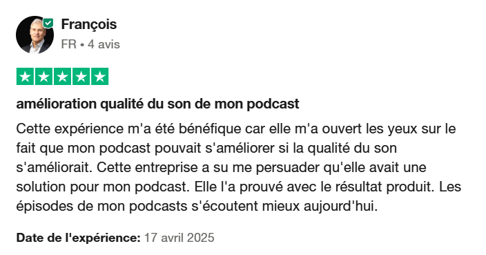 Je lui ai ensuite proposé une « offre test », c’est-à-dire un échantillon gratuit de l’un de ces épisodes amélioré grâce à mon service de postproduction. François a tout de suite perçu la différence : il a trouvé « qu’il n’y avait pas photo » et que le son était bien plus audible, ce qui lui permettait de mieux se faire entendre.