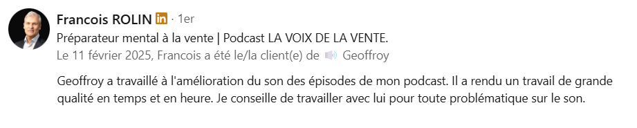Début janvier 2025, je lui ai fait un feedback sur la qualité sonore de son podcast basé sur mon expertise d’ingénieur du son.